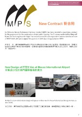 Corporate & Business development 公司及業務發展 Jornal Cheng Pou 正報 New Contract 新合同 In February, Macau Professional Services, Limited (MPS) has been awarded a supervision contract by the government for the construction of new public housing. The 21-storey residential building will locate on Choi Long Street in Taipa. The total amount of this new supervision contract is at the amount of MOP19,681,200 and is signed for a period of 1,000 days. Congratulations MPS! 於本年二月,澳門專業顧問有限公司(MPS)獲政府給判新公共房屋建造工程的監察合約。該幢21 層高的公屋住宅將落於氹仔聚龍街。新獲得的監察合約總金額為澳門幣19,681,200元,為期1,000 天。恭喜MPS! New Design of FTES Van at Macau International Airport 全新設計位於澳門國際機場的貨車 In March, a new vehicle sticker design will appear on three vans for Focus Technical and Energy Services, as seen below. 於三月份,澳門技術及能源服務有限公司添置了三輛全新貨車,車身圖案設計亦隨之煥然一新。 7