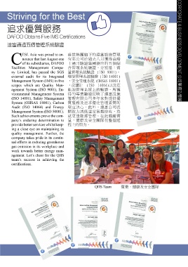 Striving for the Best 追求優質服務 DAFOO Obtains Five IMS Certifications 達富通過五個管理系統驗證 ESL Asia was proud to an- 盛世集團旗下的達富設施管理 CORPORATE & BUSINESS DEVELOPMENT 公司業務及發展 nounce that last August one 有限公司於過去八月獲得由瑞 Cof its subsidiaries, DAFOO 士通用驗證集團發出的五個綜 Facilities Management Compa- 合管理系統驗證,分別是:質 ny Limited, has passed the SGS 量管理系統驗證 (ISO 9001), external audit for its Integrated 環境管理系統驗證 (ISO 14001) Management System (IMS) in five ,安全管理系統 (OHSAS 18001) scopes which are Quality Man- ,炭審計 (ISO 14064)以及在 agement System (ISO 9001), En- 能源管理系統上的驗證。所獲 vironmental Management System 得的專業驗證反映了達富設施 (ISO 14001), Safety Management 管理有限公司多年來對提供優 System (OHSAS 18001), Carbon 質服務及追求優化管理素質的 Audit (ISO 14064) and Energy 堅定決心。此外,達富公司長 Management System (ISO 50001). 期致力減低溫室氣體排放,造 Such achievements prove the com- 就更佳能源管理。在此感謝質 pany’s enduring determination to 量,健康及安全團隊在整個過 provide better services whilst keep- 程上的努力。 ing a close eye on maintaining its quality management. Further, the company takes pride in its contin- ual efforts in reducing greenhouse gas emission in its workplace and work towards better energy man- agement. Let’s cheer for the QHS team’s success in achieving the certifications. QHS Team 質量,健康及安全團隊