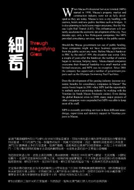 hen Macau Professional Services Limited (MPS) started in 1998, Macau’s property market and Wconstruction industry were not as fully devel- oped as they are today. Macau is now a city bustling with casinos, hotels and new public facilities such as bridges. It is also planning to build some major structures, like the Ma- cau Light Rail Transit (LRT). This infrastructure will cer- tainly accelerate the economic development of the city. Two decades ago, only a few Portuguese companies like MPS provided consultancy services, mainly to the public sector. Should the Macau government run out of public funding, those companies might not have business opportunities from the public sector any more. Before Macau’s handover to PRC by the end of 1999, the situation was worse. Only a couple of years after the handover, the number of casinos began to increase, helping many Macau-based companies overcome their financial hardship in a small market with limited resources, and MPS was no exception. Since 2001 the company has supervised a number of government pro- jects such as the Olympic Swimming Pool Facilities. Does the development of the gaming industry increase eco- nomic benefits for consultancy companies in Macau? The 13 to embark upon a promising industry by working with the casino boom began in 2001 when MPS had the opportunity Venetian (in Sands Macau Peninsula casino). Even during the global financial crisis in 2008, many major projects of other companies were suspended but MPS was able to keep most of its staff. MPS is currently providing services in three different areas: design, supervision and statutory support to Venetian pro- jects in Macau. 當澳門專業顧問有限公司(MPS)在1998年開始營運時,那時的房地產市場和建築業跟現在的繁榮景象 相差甚遠。今天的澳門已是一個蓬勃的城市,到處可見到賭場、酒店、橋樑和其他新的公共設施, 澳門正計劃興建更多的大型基建,如澳門輕軌,這都有助加速澳門的經濟發展。回想二十年前的澳 門,只有少數如MPS的葡萄牙企業提供顧問服務,而這些企業的客户主要是公營機構。 倘若政府耗盡公帑,這些企業在商機上將面臨困境,特別在1999年澳門回歸前,尤其困難。回歸短 短數年,在澳門這資源有限的彈丸之地,賭場的增加確實幫助了不少本地企業在這細小的市場裡跨 越經營困境;MPS亦不例外。從2001年開如,MPS主要為政府監督工程,如奧林匹克游泳池設施。 究竟博彩業的發展能否為本地的顧問公司帶來收益?自2001年賭場興建熱潮開始後,MPS有機會在這 極具前景的行業上發展,並與威尼斯人(澳門半島金沙賭場)合作。即使在2008年全球金融危機下, 儘管眾多本澳大型發展項目都需要中止時,MPS仍可保留其大部分員工。 MPS目前提供三個不同的主要服務,包括設計,監理及澳門威尼斯人項目的法律諮詢。