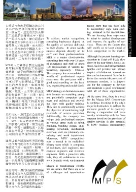 市場認可程度是根據諮詢公司 facing MPS that has been able 為客戶所提供的服務質素而 to successfully cope with shift- OUR PEOPLE DEVELOPMENT 我們的員工發展 定。換言之,這是取決於企業 ing demand in the marketplace. 員工及他們的專業水平。MPS We are learning from experience 是一間以客為本、擁有超過15 To achieve market recognition, to adapt to market development 年經驗及約100名來自不同國 consulting businesses depend on and improve the quality of ser- 籍專業人才的企業,而大部分 the quality of services delivered vices. These are the factors that 的人才是本地的中國籍人士。 to their clients. In other words, will enable us to keep ahead of 公司在這些年來已積累了不少 success depends directly on its keen competition in the market. 專業經驗,已非常了解本地有 staff and their professionalism. Although the present buzzing con- 關法例、工程和社會結構。 MPS is a major client-oriented struction in Cotai will likely slow consulting firm with over 15 years of experience and staff of about down in the near future, hotels, ca- MPS的人力資源計劃也包括聘 100 professionals of various na- sinos, facilities and infrastructures 用年輕和有潛質的工程師和 tionalities, especially Chinese. (public and private) will always 建築師,給予他們適當和優質 The company has accumulated a require refurbishment, reconstruc- 的培訓,從而確保公司能持續 wealth of professional experi- tion and enhancement. In order to 提供高水準的服務。此外,公 ences over the past years with a foster the sustainable provision of 司更在不同的領域上不斷發 good understanding on the local necessary services, it is import- 展它的專業服務,如城市規 law, engineering and social fabric. ant for the company to develop 劃,建築設計,工程(結構, and maintain a good relationship 機械,電氣,土木等)的法定 MPS’ strategy on human resources with all of these organizations. 諮詢和監督工作。再者,MPS also focuses on recruiting young At the same time, there is a need 的競爭力源於由建築、土木工 and potentially competent engi- for the Macau SAR Government 程、機械和電氣工程師所組 neers and architects and provid- to continue investing in the city’s 成跨領域的團隊,以及他們 ing them with quality training. major infrastructure to address the 積極和通力合作的工態度。 They aim to continuously achieve meteoric growth of its economy. the objective of maintaining high standards of service provision. Having a cooperative and trust- 眾所周知,澳門正在急速發展 worthy relationship with the Gov- 並帶來很多的挑戰和機遇。至 Additionally, the company de- ernment based on the provision of velops their professional services 今,MPS已能成功地應對市場 in various areas such as urban quality services is also essential 上不斷變化的需求,努力地從 planning, building design, engi- to MPS’ business sustainability. 經驗中學習,適應現況,以提 neering (structural, mechanical, 高其服務質量。這些都是促進 electrical, civil, etc.) statutory con- 公司保持競爭優勢的因素。 sultancy and work supervision. Moreover, MPS’ competitive- 雖然目前在路氹區所看到的施 ness is rooted in its multidisci- 工地很有可能在不久的將來慢 plinary team which is composed 慢放緩下來,但酒店、賭場、 of architects, civil engineers, me- 設施及基建 (公營和私營) 等 chanical engineers and electrical 始終需要翻新、重建與擴充。 engineers. With a proactive atti- 因此,為促進業務的可持續發 tude, they all collaborate to cre- 展,企業與和有關機構都須繼 ate a dynamic work environment. 續發展和保持良好的關係。 Macau is transforming swiftly. We are aware that there are a lot 與此同時,澳門特區政府將需 of challenges and opportunities 要繼續投資在大型基建項目以 解決其經濟的快速增長,因 此,為保障MPS業務發展的可 持續性,提供優質服務是保持 雙方合作和良好關係的重點。