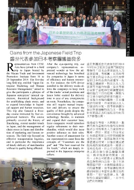 Gains from the Japanese Field Trip OUR PEOPLE DEVELOPMENT 我們的員工發展 盛世代表參加日本考察團獲益良多 epresentatives from CESL After the eye-opening trip, our 盛世集團派出代表參加於2014 Asia have joined in a field company’s representatives ex- 年9月16日至20日由澳門貿促局 Rtrip to Japan hosted by pressed wonder at how the ad- 舉辦的「日本企業營銷及人力 the Macau Trade and Investment vanced technology has benefited 資源管理」考察團。五天的考 Promotion Institute from 16 to the companies in Japan in terms 察主要目的是令各公司代表學 20 September 2014. The five-day of efficiency and human resourc- 習到日本的企業內部運作、如 long field trip, entitled “Japan En- es. For instance, the GPS device 何建立連鎖店、物流以及人力 terprise Marketing and Human installed in the delivery trucks al- 資源等方面的知識。是次考察 Resource Management,” aimed to lows the companys to keep track 亦安排了當地四位經驗豐富的 give the participants a glimpse of of the trucks’ actual positions and 導師進行三日的授課,課程內 Japanese enterprises’ internal op- hence better control the delivery 容主要介紹特許經營的歷史、 erations, theoretical background time in case of any emergiencies for establishing chain stores, and en route. Nonetheless, the compa- 日本現今市場的趨勢、日本連 to expand knowledge in logisti- nies still require manual inspec- 鎖店的經營、市場營銷以及人 cal support and human resources. tion and delivery to ensure the 力資源的分配。而考察參觀方 This trip also featured a three- quality of their goods despite the 面以學習運輸物流為主,學習 day course instructed by four ex- convenience brought by advanced 如何把商品及時送抵目的地而 perienced lecturers. The course technology. Besides, to maintain 又不影響品質。 primarily covered the history of and expand their customer base, franchising, current market trends those companies would introduce 透過這次考察,大開眼界,集 in Japan, and the management of regular refinement to their mer- 團代表為當地的先進科技如何 chain stores in Japan and distribu- chandise, which would also incur 提昇公司效率及人力資源表示 tion of marketing and human re- positive influence on their sales. 驚訝。例如,貨車上的全球定 sources. The field trip focused on Another source of amazement for 位系統能夠使公司時刻追蹤貨 effective transportation logistics, our representatives came from the 車所在位置,從而能夠更有效 and in particular the importance concepts of “Customers are the 掌握運送時間,以應付運送過 of timely delivery of merchandize god” and “The best reserved for 程出現的延誤或意外。縱使日 without its quality being affected. the locals,” which are deeply in- 本科技先進,但公司亦堅持以 grained in the Japanese enterprise 員工親自進行貨品檢驗及運 culture. 送,務求保持貨物質素。此 外,日本公司都會不定期為其 產品貨物進行改良,除了有助 鞏固客戶群,亦會間接提高公 司的銷售額。而考察課程裡所 提到兩個日本當地企業文化的 思想-「客戶就是神」及「最 好的永遠留給國民」,亦令代 表們有所領悟 。