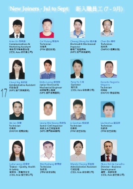 New Joiners - Jul to Sept 新入職員工 (7 - 9月) New Joiners - Jul to Sept 新入職員工 (7 - 9月) Aries Un 阮春鵬 Cai Yixiang 蔡義祥 Cheang Weng Kei 鄭永基 Chen Bin 陳彬 Communications & Technician Electrical & Mechanical Technician Marketing Assistant 技術員 Inspector 技術員 傳訊及市場推廣助理 (FFM 盛世設施) 機電工程監察員 (DAFOO 達富設施) (CESL Asia 盛世總公司) (MPS 澳門專業顧問) Cheryl Ng 吳詩敏 Eddie Leong 梁海健 Fang Ye 方葉 Gerardo Nagorite Operator Magarro Junior Electrical & Administrative Assistant 17 行政助理 Mechanical Engineer 操作員 Technician 技術員 初級機電工程師 (CESL Asia 盛世總公司) (MPS 澳門專業顧問) (DAFOO 達富設施) (MPS 澳門專業顧問) He Jun 賀君 Leung Wai Keung 梁偉強 Li Guichao 黎貴朝 Liu Hanhua 劉漢華 Technician Senior Civil Inspector Technician Technician 技術員 高級土木工程監察員 技術員 技術員 (DAFOO 達富設施) (MPS 澳門專業顧問) (FFM 盛世設施) (FFM 盛世設施) Lydia Leong 梁佩華 Mai Rusheng 麥儒勝 Mandy Cheong 張慧敏 Nuno Kol de Carvalho Trainee - Quality, Health Technician Administrative Assistant Director - Business & Safety 技術員 行政助理 Development 實習生 – 質量及安全 (FFM 盛世設施) (CESL Asia 盛世總公司) 總監 – 業務發展 (CESL Asia 盛世總公司) (CESL Asia 盛世總公司)