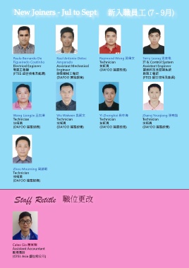New Joiners - Jul to Sept New Joiners - Jul to Sept 新入職員工 (7 - 9月) New Joiners - Jul to Sept 新入職員工 (7 - 9月) New Joiners - Jul to Sept 新入職員工 (7 - 9月) 新入職員工 (7 - 9月) Aries Un 阮春鵬 Cai Yixiang 蔡義祥 Cheang Weng Kei 鄭永基 Chen Bin 陳彬 Paulo Bernardo De Raul Antonio Datoc Raymond Wong 黃偉文 Terry Leong 梁家祺 Communications & Technician Electrical & Mechanical Technician Figueiredo Coutinho Amparado Technician IT & Control System Marketing Assistant 技術員 Inspector 技術員 Electrical Engineer Assistant Mechanical 技術員 Assistant Engineer 傳訊及市場推廣助理 (FFM 盛世設施) 機電工程監察員 (DAFOO 達富設施) 電氣工程師 Engineer (DAFOO 達富設施) 資訊科技及控制系統 (CESL Asia 盛世總公司) (MPS 澳門專業顧問) (FTES 盛世技術及能源) 助理機械工程師 助理工程師 (DAFOO 達富設施) (FTES 盛世技術及能源) Cheryl Ng 吳詩敏 Eddie Leong 梁海健 Fang Ye 方葉 Gerardo Nagorite Wang Liangze 王良澤 Wu Weiwen 吳蔚文 Yi Zhonghai 易中海 Zhang Youqiang 張有強 Administrative Assistant Junior Electrical & Operator Magarro Technician Technician Technician Technician 行政助理 Mechanical Engineer 操作員 Technician 技術員 技術員 技術員 技術員 (MPS 澳門專業顧問) 初級機電工程師 (CESL Asia 盛世總公司) 技術員 (DAFOO 達富設施) (DAFOO 達富設施) (DAFOO 達富設施) (DAFOO 達富設施) (MPS 澳門專業顧問) (DAFOO 達富設施) Zhou Mouming 周謀明 He Jun 賀君 Leung Wai Keung 梁偉強 Li Guichao 黎貴朝 Liu Hanhua 劉漢華 Technician Technician Senior Civil Inspector Technician Technician 技術員 技術員 高級土木工程監察員 技術員 技術員 (DAFOO 達富設施) (DAFOO 達富設施) (MPS 澳門專業顧問) (FFM 盛世設施) (FFM 盛世設施) Lydia Leong 梁佩華 Mai Rusheng 麥儒勝 Mandy Cheong 張慧敏 Nuno Kol de Carvalho Trainee - Quality, Health Technician Administrative Assistant Director - Business & Safety 技術員 行政助理 Development 實習生 – 質量及安全 (FFM 盛世設施) (CESL Asia 盛世總公司) 總監 – 業務發展 Caleo Sio 蕭家明 (CESL Asia 盛世總公司) (CESL Asia 盛世總公司) Assistant Accountant 助理會計 (CESL Asia 盛世總公司)