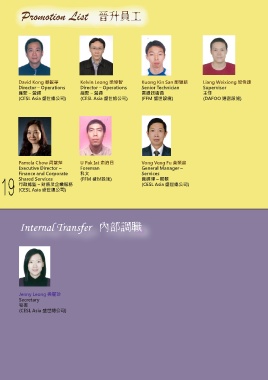 Promotion List David Kong 鄺銳華 Kelvin Leong 梁偉智 Kuong Kin San 鄺健新 Liang Weixiong 梁偉雄 Director – Operations Director – Operations Senior Technician Supervisor 總監 – 營運 總監 – 營運 高級技術員 主任 (CESL Asia 盛世總公司) (CESL Asia 盛世總公司) (FFM 盛世設施) (DAFOO 達富設施) Pamela Chow 周望萍 U Pak Iat 俞泊日 Vong Veng Fu 黃榮富 Executive Director – Foreman General Manager – 19 Shared Services (FFM 盛世設施) 總經理 – 服務 科文 Services Finance and Corporate (CESL Asia 盛世總公司) 行政總監 – 財務及企業服務 (CESL Asia 盛世總公司) Jenny Leong 梁麗珍 Secretary 秘書 (CESL Asia 盛世總公司)