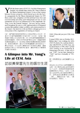 DP, the former name of FOCUS - Facilities Management Limited, was already there before Mr. Vong worked at Ythe Macau International Airport. It was a joint venture between foreign companies which teamed up to provide facil- ity management for the Macau International Airport. In 1995 there weren’t any companies with the technical know-how and OUR PEOPLE DEVELOPMENT 我們的員工發展 even knowledge providing such management services or even operational services in an infrastructure of this magnitude. Mr. Vong is now the General Manager - Services, having contrib- uted throughout his career to the implementation of integrated systems that enabled a better workflow and communications in the Airport. Our interview with our fellow colleague gives us a clear picture of the singularities of running an Airport. YDP,澳門盛世設施管理有限公司創立時的公司名字,在 C&M: When did you join CESL Asia 黃先生於澳門國際機場工作前已經一直沿用。YDP是一個 Group? 與國外多間公司合資的企業,並一併為澳門國際機場提供 設施管理服務。當時1995年的澳門根本沒有一間擁有專業 I joined CESL Asia in October 2011. 技術或知識的公司,能為如此規模的基礎設施提供設施管 Before that I was working for ADA 理,抑或營運服務。黃先生在他整個職業生涯中設計出一 (FOCUS client). My working relation- ship with FOCUS, or CESL Asia, can 體化的系統,大大改善了機場內的工作流程及溝通。通過 be traced back to 1996 when I joined 訪問這位現任公司的總經理-服務,讓我們更加了解機場 ADA working in the Engineering & 營運當中的奧祕。 Maintenance Division. At that time it was “YDP”, having later changed to A Glimpse into Mr. Vong’s “Y&T” and then eventually to “FO- CUS”. Life at CESL Asia 問:何時開始加入盛世集團的大家 庭? 訪談黃榮富先生的盛世生涯 我在2011年10月加入盛世集團的大 家庭,而之前是在ADA(盛世設施的 客戶)工作。我與盛世設施或盛世 集團結緣於1996年,在那一年我 加入ADA從事工程及維修保養的工 作。當時盛世設施管理的名稱為 「YDP」, 隨後改名為「Y&T」,最 終為現時的「FOCUS」。