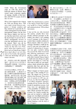 C&M: When the Government 問:較早前你建立了一套十分 came up with this project, to 實用的系統,改善了機場的工 build the Airport in Macau, there 作流程及內部溝通。可否藉此 weren’t many companies capable 向大家介紹一下? of running a facility of this kind. How did FOCUS prepare itself to 其實這套系統並不是我發明 take the role? 的,因為實際上這套軟件早 When I first stepped in the Airport C&M: You implemented a system 已存在市場上。但當時身為資 the YDP was already there. YDP in the Macau Airport that became 訊科技技術經理的我,暫時未 was a joint venture between com- very useful for a better workflow 想到適合在機場使用的解決方 panies of foreign countries and and communications. Tell us about 案。然而經過兩年時間的研 they teamed up to provide the fa- that system. 究,及當時的外判公司未能達 cilities management for the Macau 到我們要求的水平,加上昂貴 International Airport. By the time I was not the one who invented 的服務收費及保養成本,所以 that Macau Airport was built no this system, actually there were 我決定成立一個團隊替機場度 one had the know-how (and even already software packages in the 身訂造解決方案。澳門機場面 the knowledge) to provide the fa- market, but when I was working 積較小以及因應機場內獨特的 cilities management services or as an IT manager in the Airport I 設備,我的團隊就能按實際需 even the operational services for couldn’t find a suitable solution for 要來打造自我應用程序,包括 the Airport. That’s why all the Macau Airport. After two years of 機場營運數據庫,及航班資訊 companies working in the Macau research I decided to build up my 顯示系統。 Airport by that time were Portu- own IT team and tailor-made one guese, from other countries or re- instead of outsourcing it, because 當我開始在這裡工作時,有些 gions such as Hong Kong. I didn’t this was quite expensive taking 現有的資訊科技系統需要由我 know much about it as well (like into account the initial investment 來承擔保養。西門子向機場提 most of the locals), but gradually and following maintenance costs 供全面系統服務,有些系統用 21 I built my knowledge and got to and they couldn’t provide me ex- 於ATC或機場。但這些系統缺 where I am now. actly what I wanted. Macau Airport is small and some things are quite 乏一個所謂的綜合應用,意味 問:當政府公佈在澳門建設機 specific and unique so, I used my 著所有的系統都像孤島或獨立 場時,並沒有太多公司有能力 own team to build our own appli- 系統。這種情況是不恰當的, 營運這類大型基建。而FOCUS是 cations, which included the airport 由於要重覆輸入數據的次數多 怎樣裝備自己,迎接挑戰? operation data base and also the 了,從而增加了出錯的可能 flight information display system. 性。故此,我為了紏正這種情 YDP在我於機場工作前已經一 When I stepped in I had to main- 況,我們開始建立和設計自己 直為機場服務。它與國外多 tain some of the existing IT sys- 的航班信息顯示系統,然後在 間公司聯營為機場提供設施管 tems. The airport was a turn-key 同事協助下,再逐步建立了機 理服務。那時的本地人缺乏專 solution from Siemens. There were 場營運數據庫。 業技術知識以致不能為澳門機 a lot of systems for ATC use, air- 場提供設施管理及營運服務。 port use, etc. But those didn’t have 故此,在機場工作的都是葡國 a so-called integrated approach, 人,抑或來自其他國家地區, meaning all the systems were like 例如香港。我很慶幸當初能夠 islands or standalone systems. And 跟他們合作,增進這方面的知 those were not appropriate due 識,不然便沒有今天的我。 to the possibility of doubled data entry (which increases the chance of error). So, I tried to rectify this issue and we started to build and design our own flight information display system first and then grad- ually to build the Airport Oper- ational Database with the help of my colleagues.