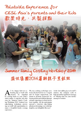 27 ll the fatigue from an ex- The two cooking workshops were Aside from adding joy to its staff’s hausting day of work will held at Kuma Kitchen on 3 August summer, the company seeks to Acertainly be dispelled and 10 August respectively, and help spread the significant message by coming home to your child’s aimed to promote interaction be- of ‘Making time for your family’ warm smiles. It explains why this tween parents and children through among its workers. year the ‘Summer Family Cook- culinary experience in their leisure ing Workshop 2014’ featured two time together. All the participants cake-baking workshops, provid- enjoyed a tutor-led cake-baking ing our staff with opportunities to afternoon brimming over with fun, enjoy a delightful family cooking laughter, and delightful flavours! experience.