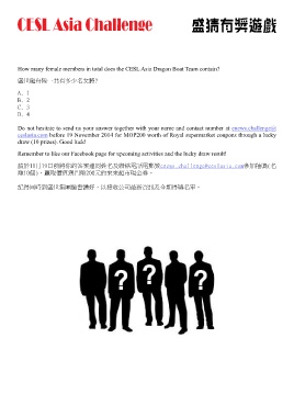 How many female members in total does the CESL Asia Dragon Boat Team contain? 盛世龍舟隊一共有多少名女將? A. 1 B. 2 C. 3 D. 4 Do not hesitate to send us your answer together with your name and contact number at enews.challenge@ ceslasia.com before 19 November 2014 for MOP200 worth of Royal supermarket coupons through a lucky draw (10 prizes). Good luck! Remember to like our Facebook page for upcoming activities and the lucky draw result! 請於11月19日前將你的答案連同姓名及聯絡電話電郵致[email protected]參加抽獎(名 額10個),羸取價值澳門幣200元的來來超市現金券。 記得同時到盛世集團臉書讚好,以接收公司最新資訊及今期得獎名單。