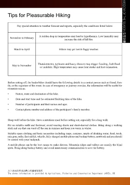 Tips for Pleasurable Hiking Pay special attention to weather forecast and reports, especially the conditions listed below. WISDOM OF THE SEASON 智慧錦囊 A sudden drop in temperature may lead to hypothermia. Low humidity may November to February increase the risk of hill fire. March to April Hikers may get lost in foggy weather. Thunderstorms, typhoons and heavy showers may trigger flooding, flash flood May to November or landslide. High temperature may cause heat stroke and heat exhaustion. Before setting-off, the leader/hiker should leave the following details to a contact person such as friend, fam- ily, or the organizer of the event. In case of emergency or journey overdue, the information will be useful for mountain rescue. • Nature, route and destination of the hike. • Date and start time and the estimated finishing time of the hike. • Number of participants and their names and ages. • Contact phone number and address of the participant’s family member. Sleep well before the hike. Have a nutritious meal before setting out, especially for a long walk. Put on suitable outfit and footwear; avoid wearing shorts and short-sleeved clothes. Bring along a walking stick and cap that can ward off the sun in summer and keep you warm in winter. Suitable spare clothing and basic necessities including maps, compass, ample of drinking water, food, torch, rain gear, radio, first-aid kit, whistle, fully charged mobile phone and backup battery, notebook and pen should be carried with your backpack. A mobile phone can be the best means to make distress. Mountain ridges and valleys are usually the blind spots. Bring along backup battery and avoid unnecessary communication to save the battery. 以上資訊由香港漁農自然護理署提供 The above information is provided by Agriculture, Fisheries and Conservation Department (AFCD), HK