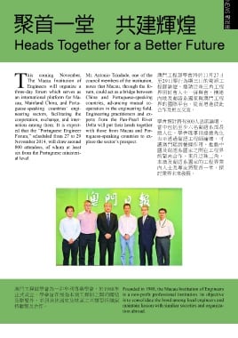 NEWS 新消息 Heads Together for a Better Future NEWS 新消息 his coming November, Mr. Antonio Trindade, one of the 澳門工程師學會將於11月27日 The Macau Institution of council members of the institution, 至29日舉行為期三日的葡語工 TEngineers will organize a notes that Macau, through the fo- 程師論壇,邀請泛珠三角工程 three-day forum which serves as rum, could act as a bridge between 界研討會人士一併與會,構建 an international platform for Ma- China and Portuguese-speaking 內地及葡語系國家與澳門工程 cau, Mainland China, and Portu- countries, advancing mutual co- 界的國際平台,從而增進彼此 guese-speaking countries’ engi- operation in the engineering field. 合作及相互交流。 neering sectors, facilitating the Engineering practitioners and ex- cooperation, exchange, and inter- perts from the Pan-Pearl River 學會預計將有800人出席論壇, action among them. It is expect- Delta will put their heads together 當中包括至少六名葡語系部長 ed that the “Portuguese Engineer with those from Macau and Por- Forum,” scheduled from 27 to 29 tuguese-speaking countries to ex- 級人仕。學會理事田達德先生 November 2014, will draw around plore the sector’s prospect. 表示透過葡語工程師論壇,可 800 attendees, of whom at least 讓澳門起到橋樑作用,推動中 six from the Portuguese ministeri- 國及葡語系國家之間在工程界 al level. 的緊密合作。來自泛珠三角, 本澳及葡語系國家的工程界業 內人士及專家將聚首一堂,探 討業界未來發展。 澳門工程師學會為一非牟利專業學會,於1988年 Founded in 1988, the Macau Institution of Engineers 正式成立。學會旨在加強本澳工程師之間的團結 is a non-profit professional institution. its objective 及聯繫外,並與其他國家及地區之同類型組織保 is to consolidate the bond among local engineers and 持聯繫及合作。 maintain liasion with similiar societies and organiza- tion abroad.