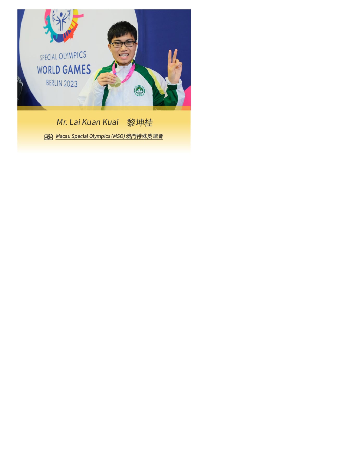 另一位傑出運動員黎坤桂,亦在盛世集團支持與自身努力下嶄露頭角,於2023年柏林夏季世界特殊奥林匹克運動會摘下金牌殊榮,為澳門增添榮耀,彰顯拼搏不懈的體育精神。