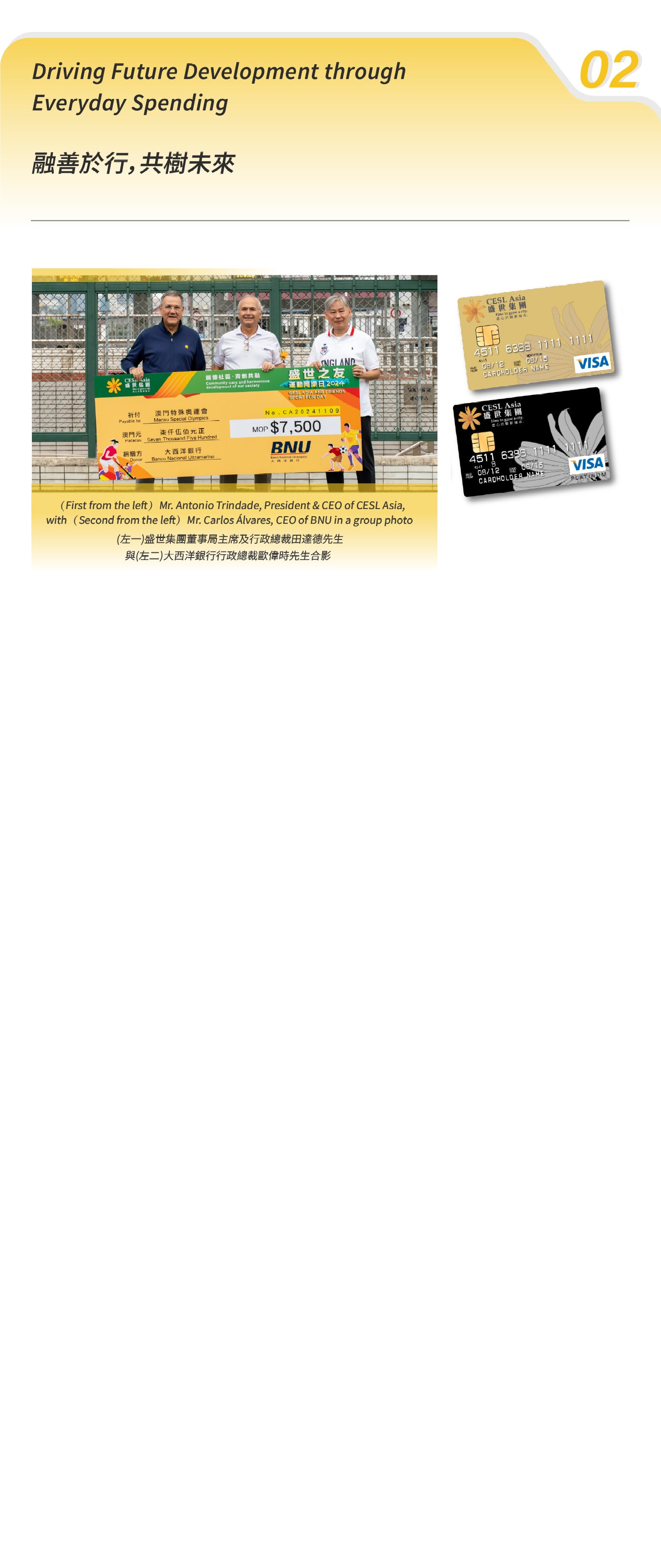 盛世集團很榮幸自2013年起與大西洋銀行攜手推出「盛世集團聯營信用卡」,開創透過日常消費推動社區發展的新模式。聯營信用卡不僅作為金融工具,更是連結公眾與社會的重要橋樑,讓每一筆消費都能化為推動澳門可持續發展的力量。